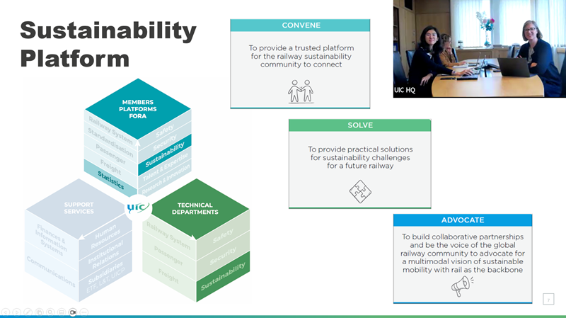 Lucie Anderton, UIC Director of Sustainability, representing both herself and Pinar Yilmazer, Head of Sustainability Programme, then provided an overview of the Platform’s work and outlined the Platform’s three core missions: