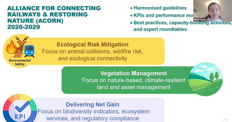 • Monika Rukia, Junior Advisor Noise and Vibration (representing Lorenzo Franzoni, Senior Advisor Sustainable Land Use), presented the mission, key activities, publications and ongoing projects of the Noise and Vibration Sector, emphasising its collaborative efforts within the global railways community. She also covered the Sustainable Land Use activities for habitat protection and biodiversity enhancement, as well the upcoming projects.