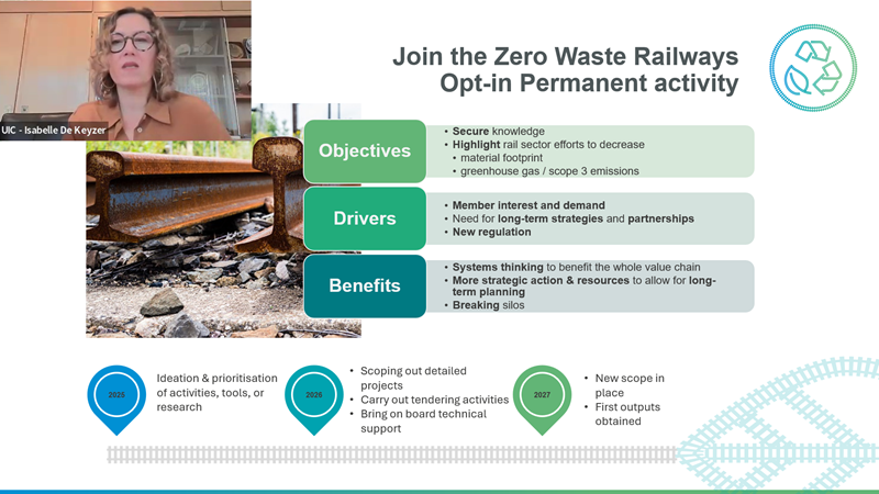 • Isabelle De Keyzer, Senior Advisor Circular Economy, presented the mission statement and vision of the Circular Economy Sector. She shared insights into the sector’s permanent activity “Zero Waste” (best practice exchange workshops) and into the ongoing work aimed at updating a UIC leaflet to align environmental specifications for new rolling stock with the latest sustainability regulations, and in particular to embed the circular economy in procurement processes.