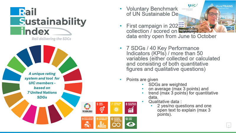 • Snejana Markovic-Chenais, Senior Advisor on Economics, provided a technical deep dive into the Rail Sustainability Index (RSI), a benchmarking tool built on seven key UN Sustainable Development Goals (SDG). She highlighted that RSI data, which is aggregated for the UIC Global Rail Sustainability Report, helps members measure performance and plan improvements.